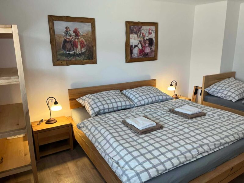 Ubytování je rozděleno do dvou oddělených budov v rámci jednoho uzavřeného areálu, což zajišťuje dostatek prostoru i soukromí. Hlavní chalupa, situovaná v řadové zástavbě, nabízí dva pokoje pro čtyři osoby. Domeček ve dvoře se nachází uvnitř areálu a disponuje dvěma pokoji pro tři osoby, s možností pronájmu dalšího dvoulůžkového pokoje za příplatek.